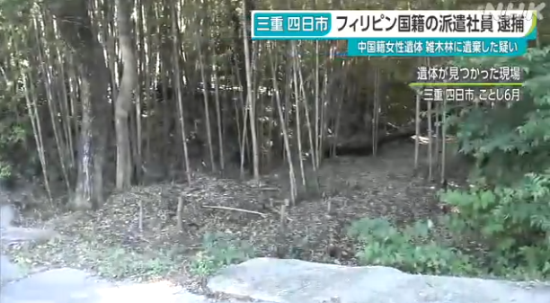日本警方稱,居住在日本三重縣四日市市的中國籍工人趙霞的遺體於2023年7月被遺棄在該市樹林內。2024年4月,其已經白骨化的遺體被一名男子發現。經調查,與趙霞在同一工廠工作的同事有遺棄屍體的嫌疑,日本警方於9月18日將該男子逮捕。