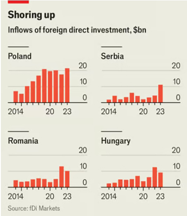 波蘭、塞爾維亞、羅馬尼亞、匈牙利外國直接投資近十年的變化趨勢 《經濟學人》製圖