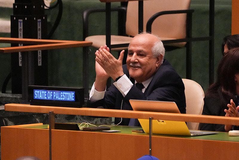 當地時間9月18日,美國紐約,聯合國大會在討論巴以問題的第十次緊急特別會議上,巴勒斯坦常駐聯合國代表里亞德·曼蘇爾對投票結果表示讚賞。視覺中國