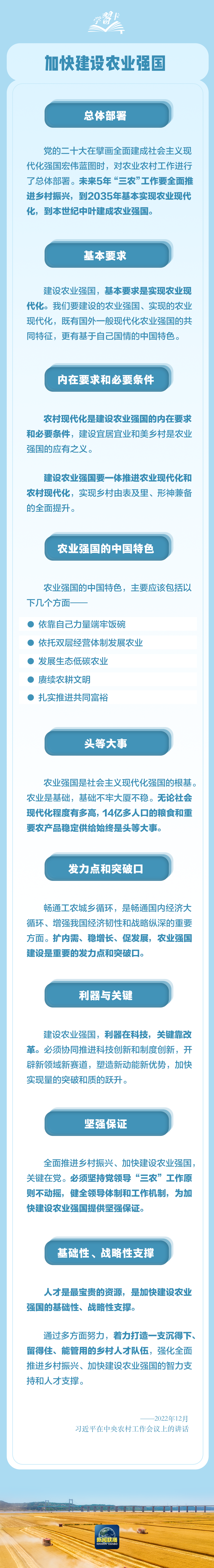 農業農村農民問題是關係國計民生的根本性問題,農業強國是社會主義現代化強國的根基。習近平總書記強調,實現高質量發展,也離不開農業發展。拓展現代化發展空間,農業農村是大有可為的廣闊天地。
