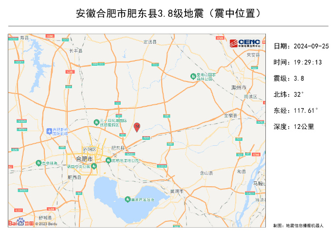 據@中國地震台網速報 消息,中國地震台網正式測定:09月25日19時29分在安徽合肥市肥東縣(北緯32.00度,東經117.61度)發生3.8級地震,震源深度12千米。