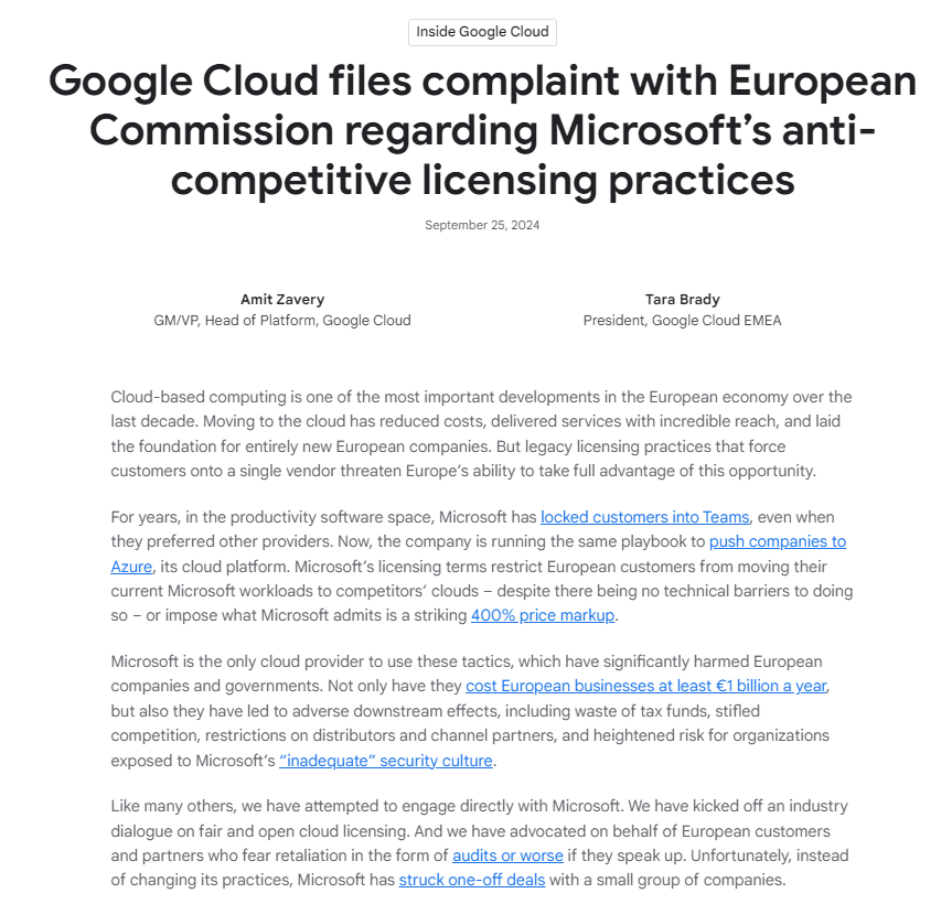 在公開文章中,谷歌聲稱,微軟的條款限制歐洲客户將他們當前的微軟工作負載,轉移到競爭對手的雲平台上(儘管這樣做沒有技術障礙),或者施加驚人的400%價格加價,“微軟是唯一一家使用這些策略的雲提供商。”