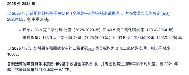 根據歐盟官方網站的最新描述,到2025年,車企的平均二氧化碳排放量需達到93.6g/km(WLTP標準下)。按照規定,自2035年起,歐盟轎車和廂式貨車的二氧化碳排放量目標均為0g/km——相當於減少100%。