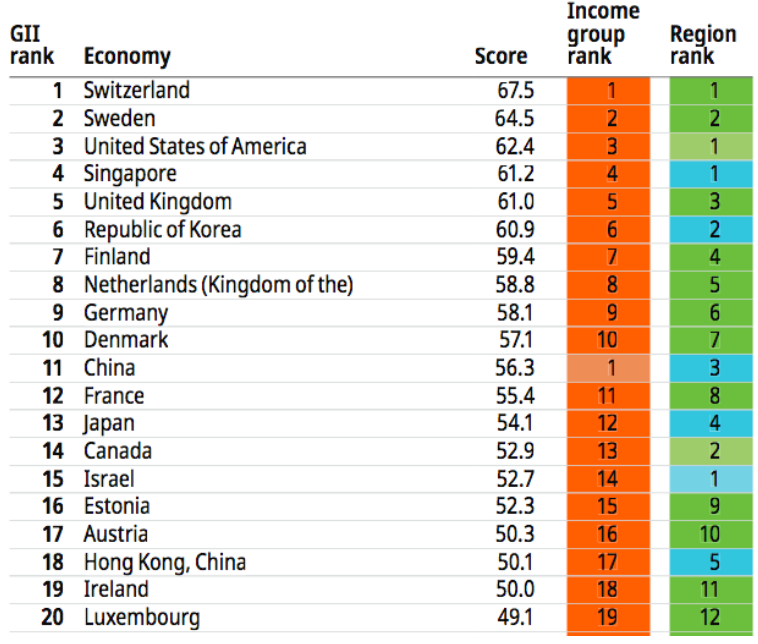 在全球創新指數對130多個經濟體的排名中,中國位居第11位,仍然是全球創新指數排名前30位中唯一的中等收入經濟體。