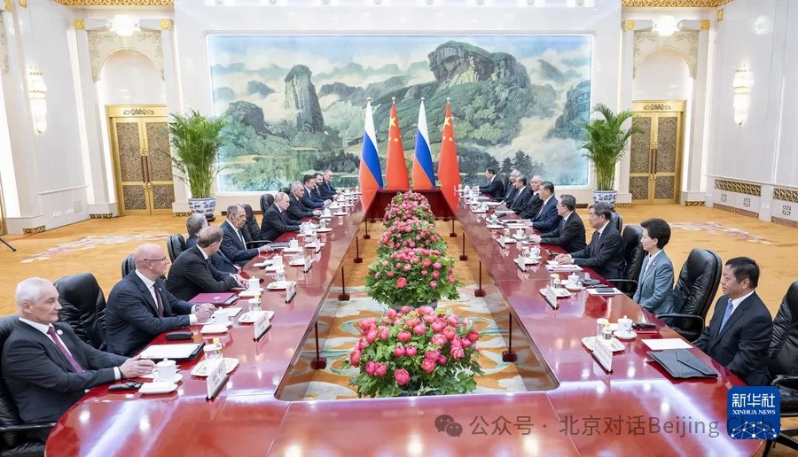 5月16日上午,國家主席習近平在北京人民大會堂同來華進行國事訪問的俄羅斯總統普京舉行會談。這是兩國元首舉行小範圍會談新華社