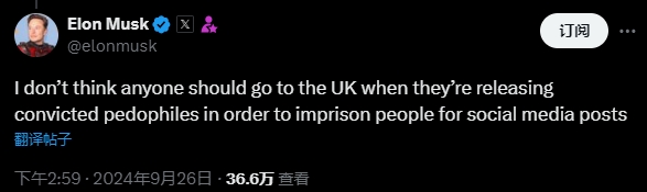 “我認為任何人都不應該去英國,因為他們釋放了被定罪的戀童癖,並把那些在社交媒體上發帖的人關進監獄。”9月26日,馬斯克在社交媒體X平台發帖寫道。