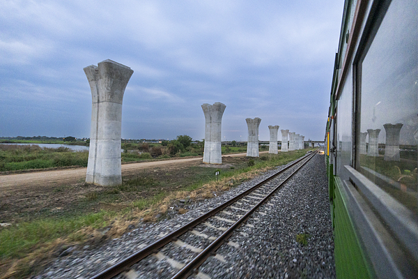 2024年1月26日,泰國曼谷到大城的火車上從車窗內拍攝正在修建的中泰鐵路(曼谷—廊開高速鐵路),修建中的鐵路橋墩。 視覺中國