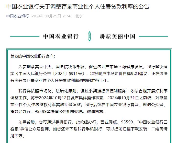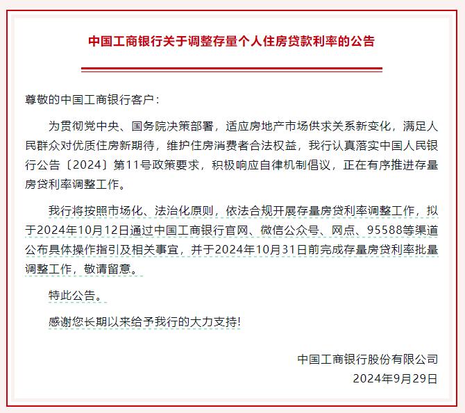9月29日晚,中國銀行、中國建設銀行、中國工商銀行、中國農業銀行分別發佈關於存量住房貸款利率調整的公告稱,落實《中國人民銀行公告[2024]第11號》要求,積極響應自律機制倡議,,正在依法有序推進降低存量商業性個人住房貸款利率工作。