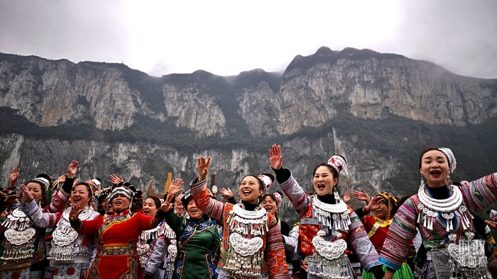 △2021年2月,習近平總書記來到貴州化屋村考察,當地村民用歡快的苗家歌舞迎接總書記。(總枱央視記者王哈男拍攝)