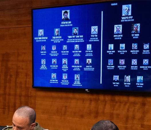以色列國防軍公佈的會議圖片顯示,辛瓦爾頭像被打上了“?” 以色列國防軍