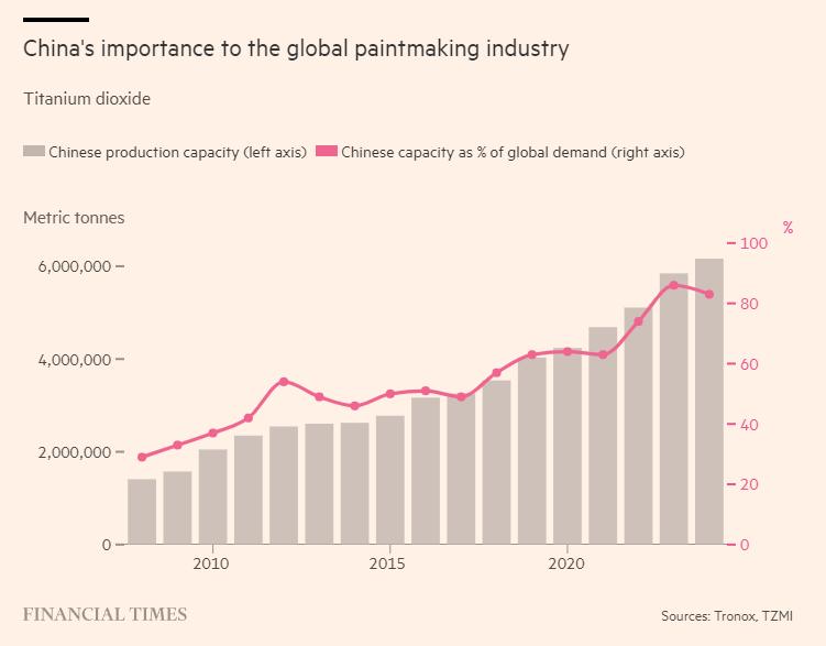 中國二氧化鈦產能佔全球消費量的份額,數據來源:Tronox、TZMI 英國《金融時報》製圖