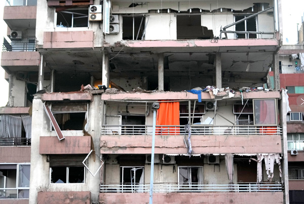 當地時間30日凌晨,以軍近一年來首次空襲貝魯特市中心,圖為受損的多層公寓樓。美聯社