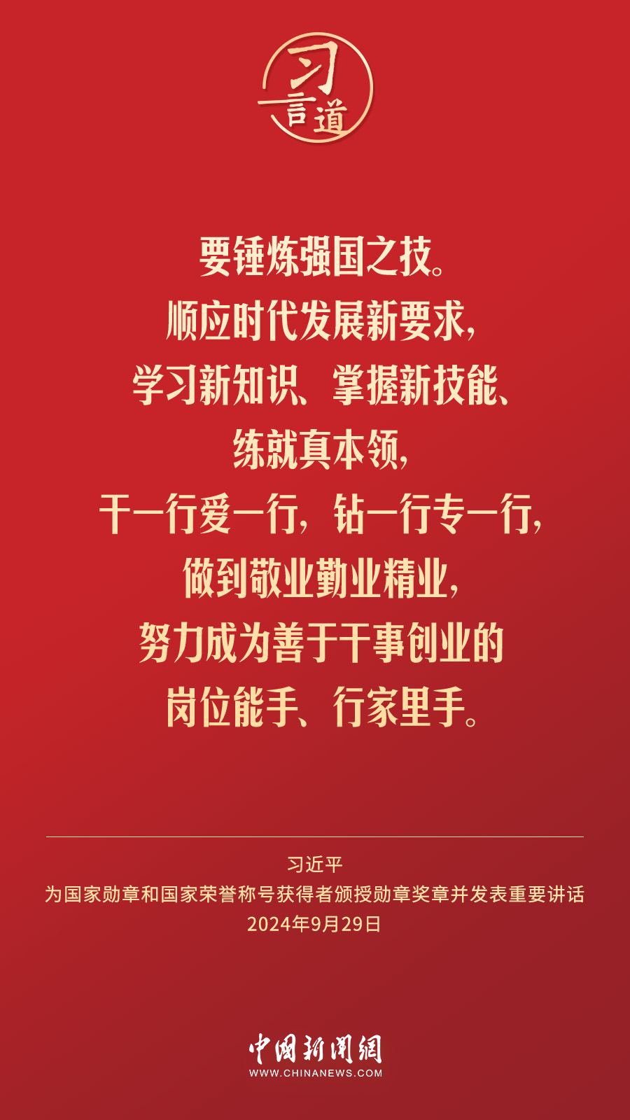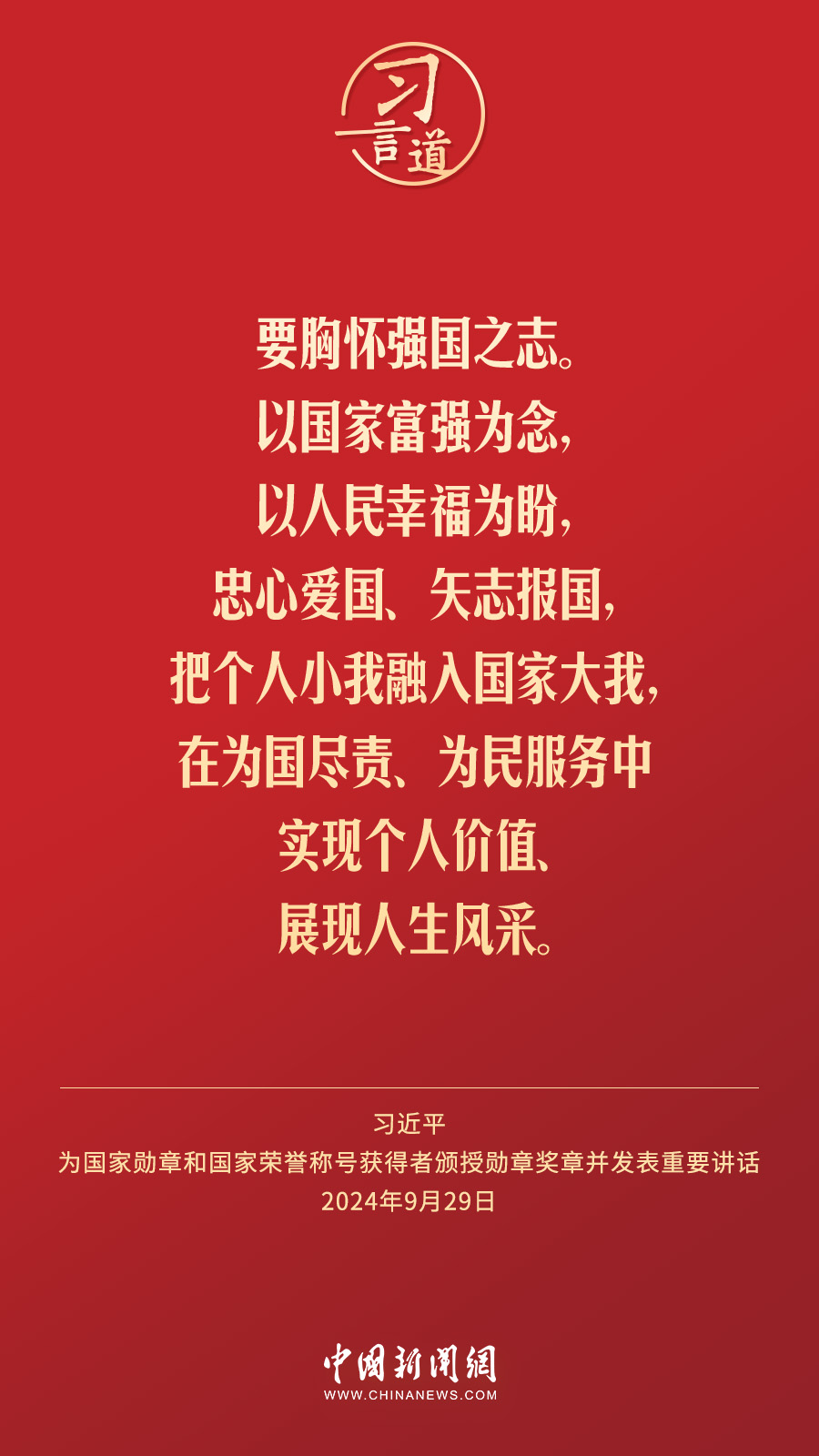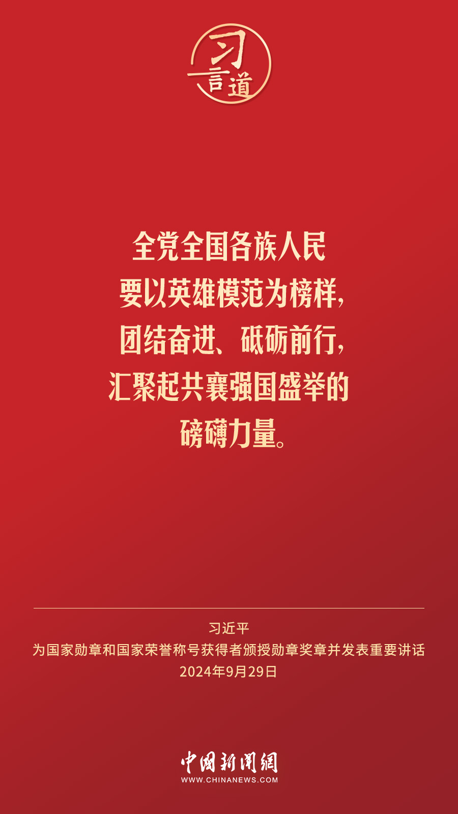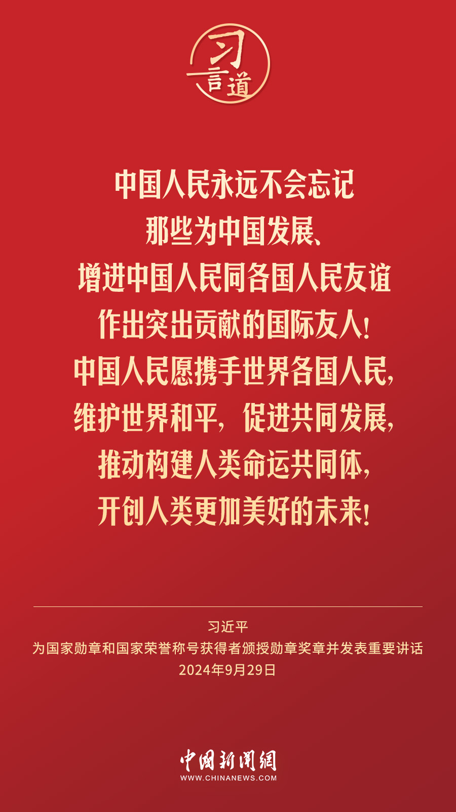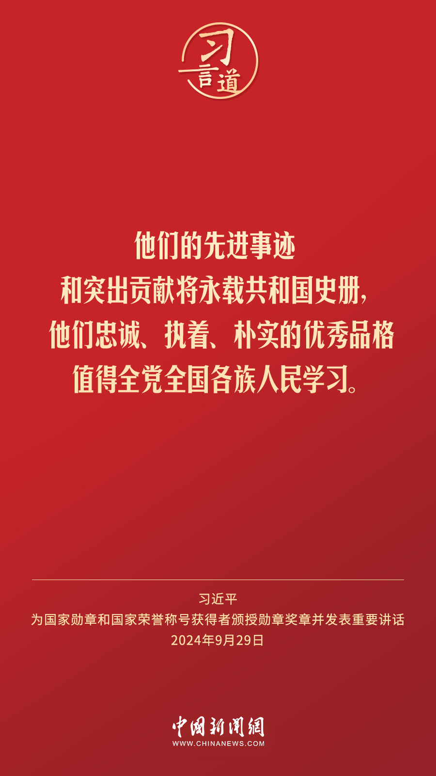經中共中央批准,中華人民共和國國家勳章和國家榮譽稱號頒授儀式於9月29日上午10時在人民大會堂隆重舉行。中共中央總書記、國家主席、中央軍委主席習近平向國家勳章和國家榮譽稱號獲得者分別授予“共和國勳章”“友誼勳章”和國家榮譽稱號獎章並發表重要講話。習近平指出——