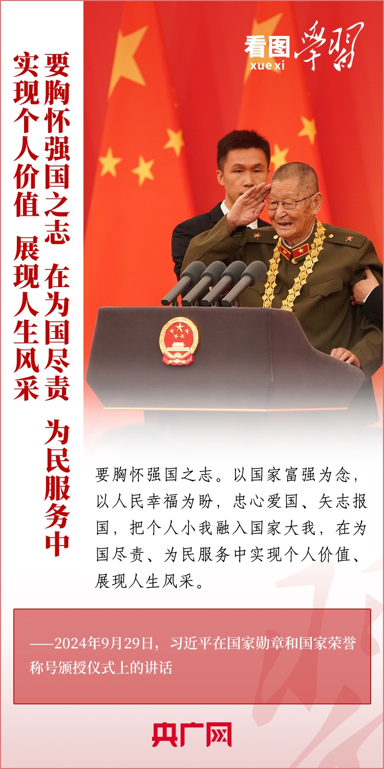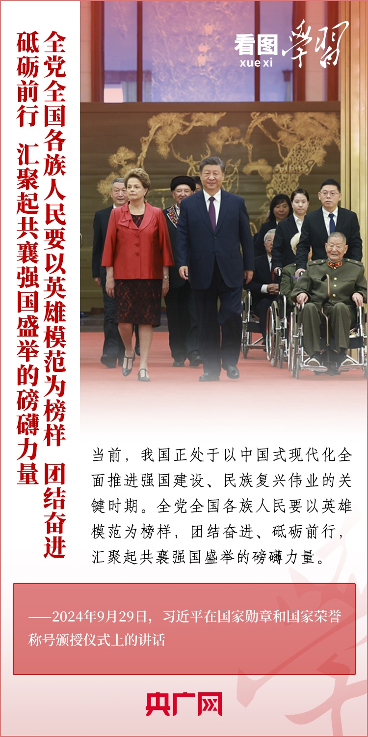 9月29日,中華人民共和國國家勳章和國家榮譽稱號頒授儀式在北京舉行,習近平總書記向國家勳章和國家榮譽稱號獲得者頒授勳章獎章並發表重要講話。總書記強調,全黨全國各族人民要以英雄模範為榜樣,團結奮進、砥礪前行,匯聚起共襄強國盛舉的磅礴力量。一起來學習!