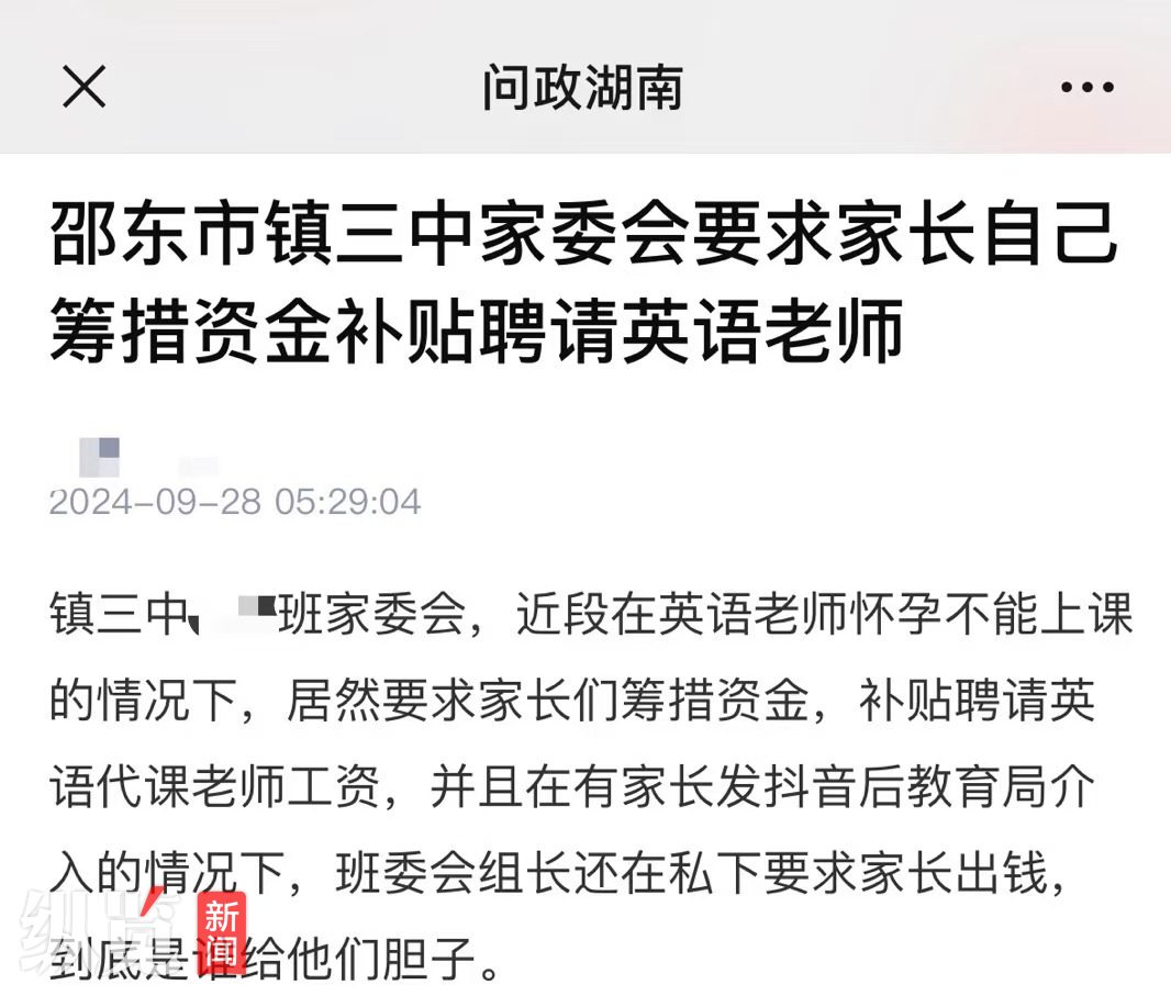 據網友在“問政湖南”平台留言稱,邵東市鎮三中某班家委會,近段在英語老師懷孕不能上課的情況下,要求家長們籌措資金,補貼聘請的英語代課老師,並且在家長反映後教育局介入的情況下,家委會組長還在私下要求家長出錢。