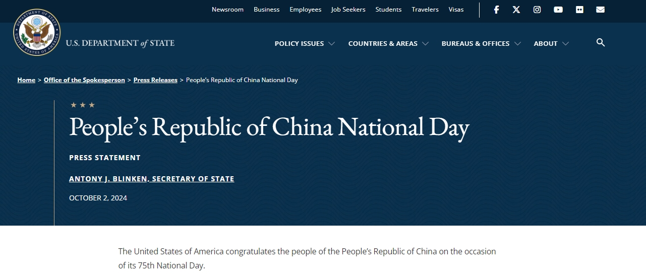 據此前報道,布林肯在去年國慶節之際也發表聲明向中國人民致以祝賀。