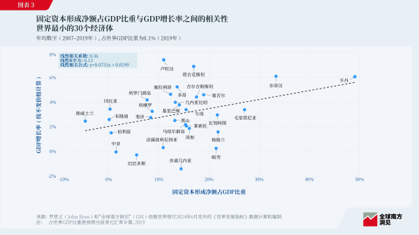 這些數據表明,大型經濟體發展模式有着共通之處。而且,對世界前30大經濟體的研究得出的結論是,這些經濟體的固定資本形成淨額佔GDP比重與GDP增長率之間存在非常強的相關性。