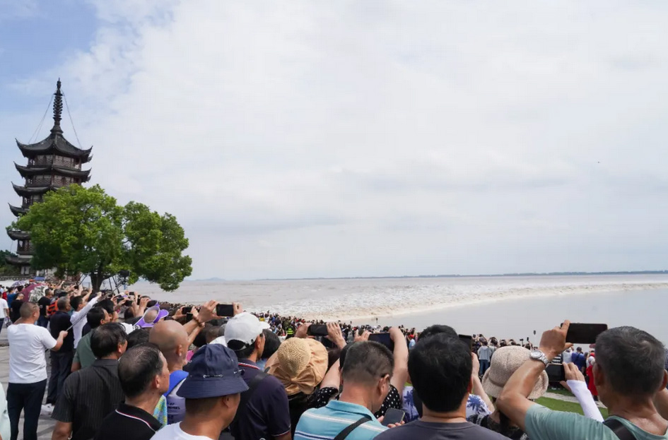 海寧鹽官觀潮勝地公園是觀賞“一線潮”的最佳位置,國慶長假期間吸引了大量遊客。
