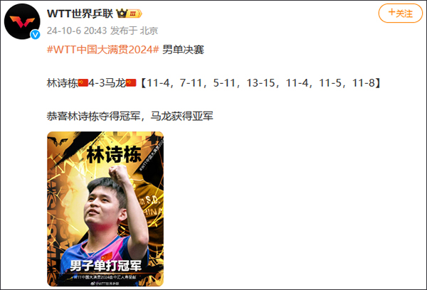 據@WTT世界乒聯 消息,WTT中國大滿貫男單決賽中,林詩棟4-3戰勝馬龍,奪得冠軍。