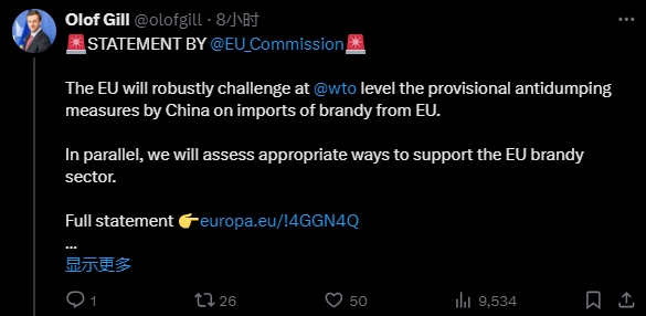 根據歐盟委員會網站消息,發言人奧洛夫·吉爾在聲明中顛倒黑白,將中方正當貿易措施污衊為“以不正當理由濫用貿易保護”,聲稱此舉“明顯違反WTO規則”,歐盟將在WTO提出挑戰,並“極其嚴肅”地對待任何針對歐盟經濟部門“不公平使用貿易防禦工具”的行為。