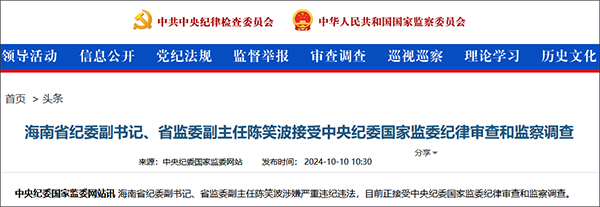 據中央紀委國家監委網站10月10日消息,海南省紀委副書記、省監委副主任陳笑波涉嫌嚴重違紀違法,目前正接受中央紀委國家監委紀律審查和監察調查。