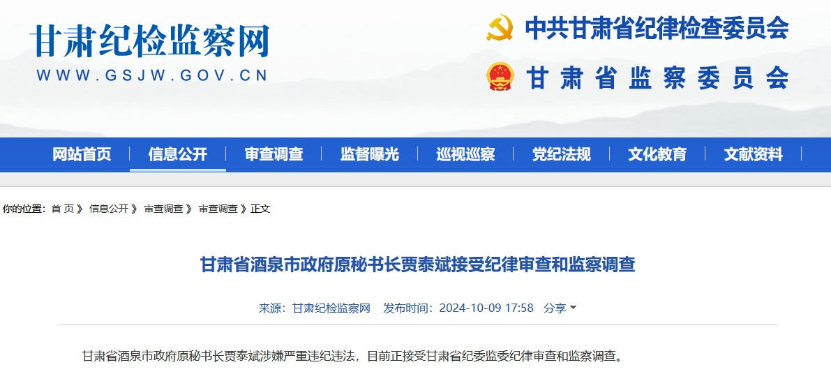 10月9日,甘肅省紀委監委發佈消息:甘肅省酒泉市政府原秘書長賈泰斌涉嫌嚴重違紀違法,目前正接受甘肅省紀委監委紀律審查和監察調查。