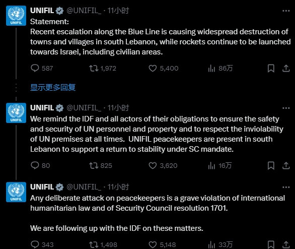 “我們提醒以色列國防軍和所有行為體,他們有義務確保聯合國人員和財產的安全,並在任何時候尊重聯合國資產的不可侵犯性。”聲明強調,“任何蓄意襲擊維和人員的行為都是嚴重違反國際人道主義法和安理會第1701號決議。”