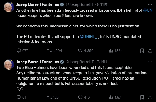 另外,歐盟安全與外交政策負責人博雷利在X平台發佈聲明,嚴厲批評了以色列“危險地跨越另一條界線”的行為。他寫道:“我們譴責這一不可接受的行為,這種行為毫無道理。”
