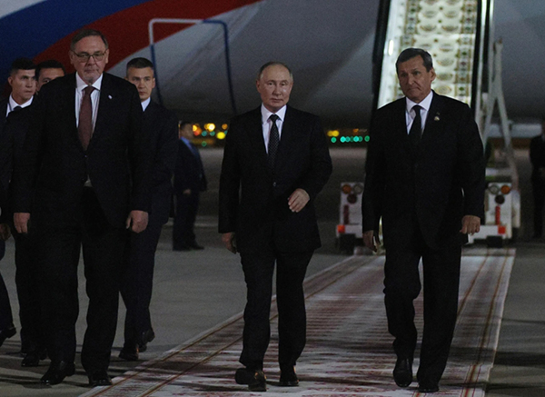 10月11日,俄羅斯總統普京抵達土庫曼斯坦,土庫曼斯坦副總理兼外長梅列多夫在機場迎接他。 美聯社