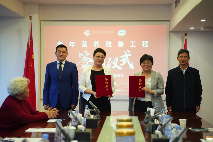 伊利集團可持續發展委員會執行秘書長喬璐(右3)、中國老齡事業發展基金會副秘書長鄭璇(右2)正式簽約