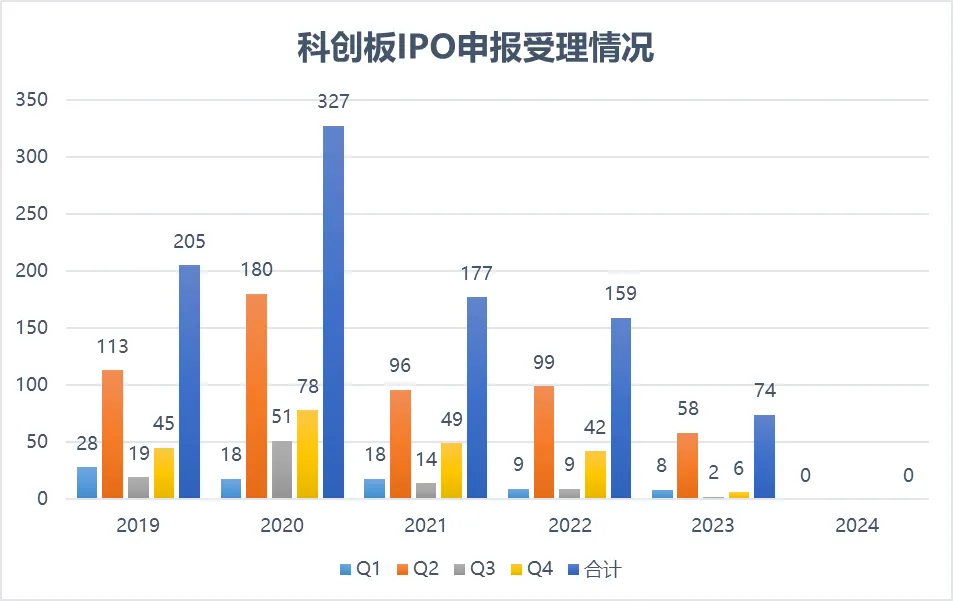 本次修改的效果可謂立竿見影,2023年科創板全年僅有74家公司申報獲得受理,較2021的177家和2022的159家公司腰斬,更是不及2020年327家公司的四分之一。