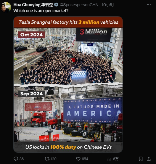 對比圖的上半部分顯示,2024年10月,特斯拉上海超級工廠第300萬輛整車正式下線;圖片下半部分顯示,2024年9月,美國宣佈對中國電動汽車徵收100%的關税。