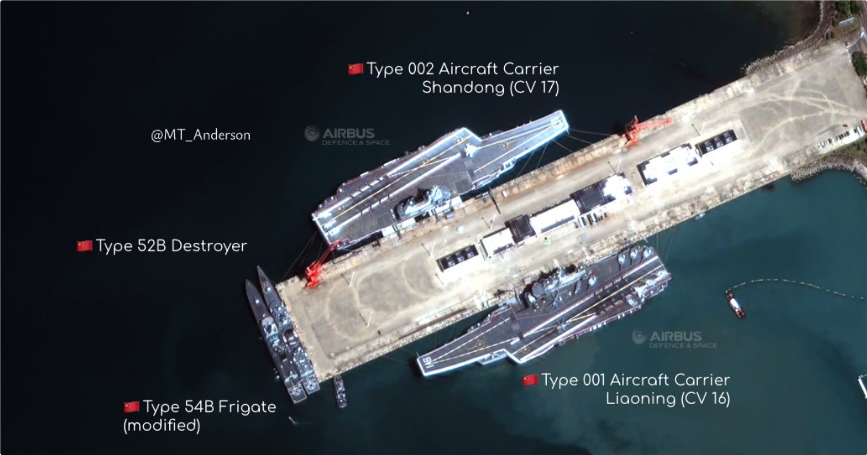 一則出現在社交媒體上,據稱拍攝於10月7日的衞星照片顯示,山東艦與遼寧艦同時停靠在三亞某軍港的碼頭上