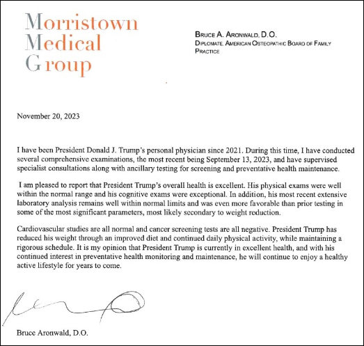 特朗普最近一次醫療報告公佈於2023年11月,當時他在其自創的社交媒體平台“真相社交”(Truth Social)上發表了一封私人醫生阿隆沃爾德(Bruce Aronwold)的信函,信中誇讚特朗普的健康狀況“非常好”