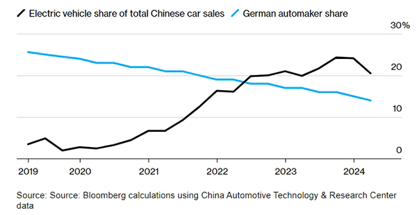 電動汽車在中國市場的份額越來越高,而德國汽車製造商在中國的市場份額卻在下降。 彭博社製圖