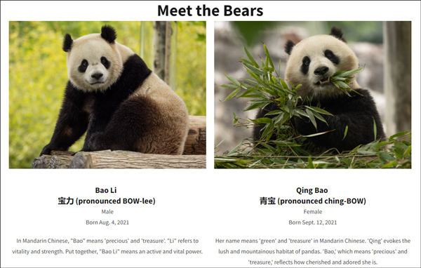 華盛頓國家動物園網站對兩隻熊貓名字的中文含義進行了解釋:在漢語中,“寶”的意思是珍貴和財富,“力”指的是活力和力量,合起來意思是積極向上、充滿活力。“青寶”的名字在漢語中意為“綠色”和“寶藏”,“青”讓人聯想到大熊貓的山地棲息地,“寶”意為珍貴和寶藏,反映了她是多麼受人珍惜和喜愛。