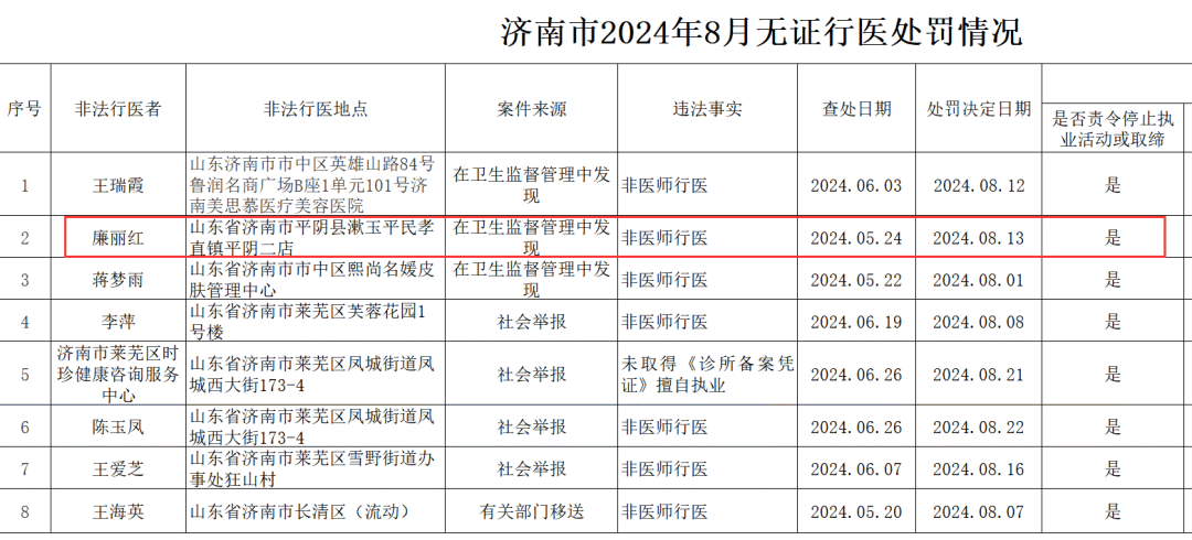 此前,漱玉平民大藥房一門店被濟南市衞健委查獲存無證行醫違法行為。據濟南市衞生健康委員會信息公開,2024年8月份濟南市共有8家單位(個人)無證行醫被處罰。其中,漱玉平民大藥店的一家門店出現在官方通報的非法行醫地點中。