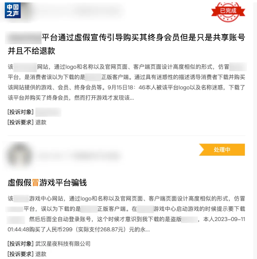 近日,記者搜索某網絡投訴平台發現,多位網友投訴被仿冒網站欺騙。其中,一位來自甘肅的楊女士(化名)告訴記者,她曾被一個仿冒的遊戲網站騙取數百元。