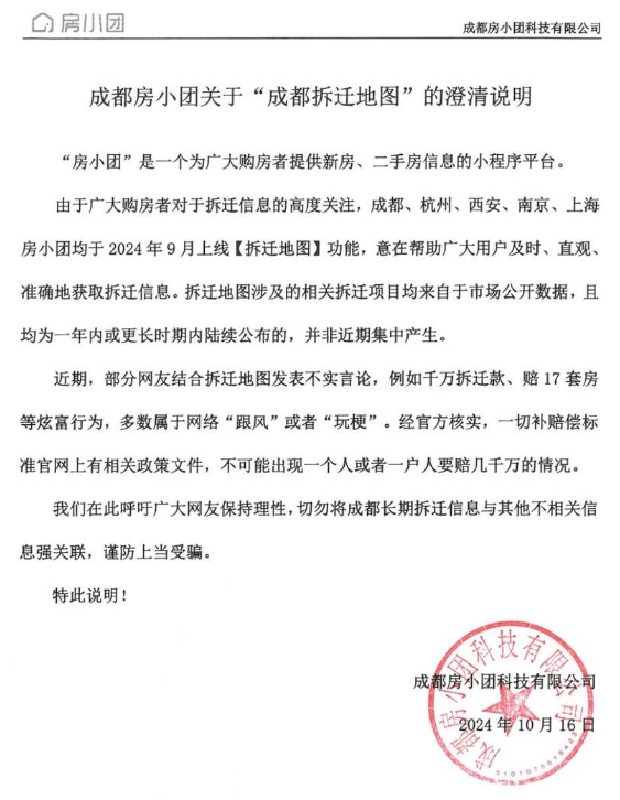 10月16日,針對網上流傳的成都拆遷地圖,“成都房小團”公眾號發佈聲明,稱拆遷地圖中項目並非近期集中產生,部分網友言論不實。