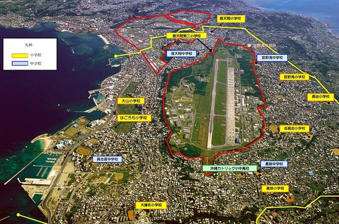 1996年,日美兩國達成協議,美國同意交還位於宜野灣市中心地區被住宅環繞的普天間飛行場,美軍基地也將搬遷至該縣名護市邊野古。他們計劃在距陸地2公里的珊瑚礁上新建美軍基地,新基地約四分之三面積需填海造地。