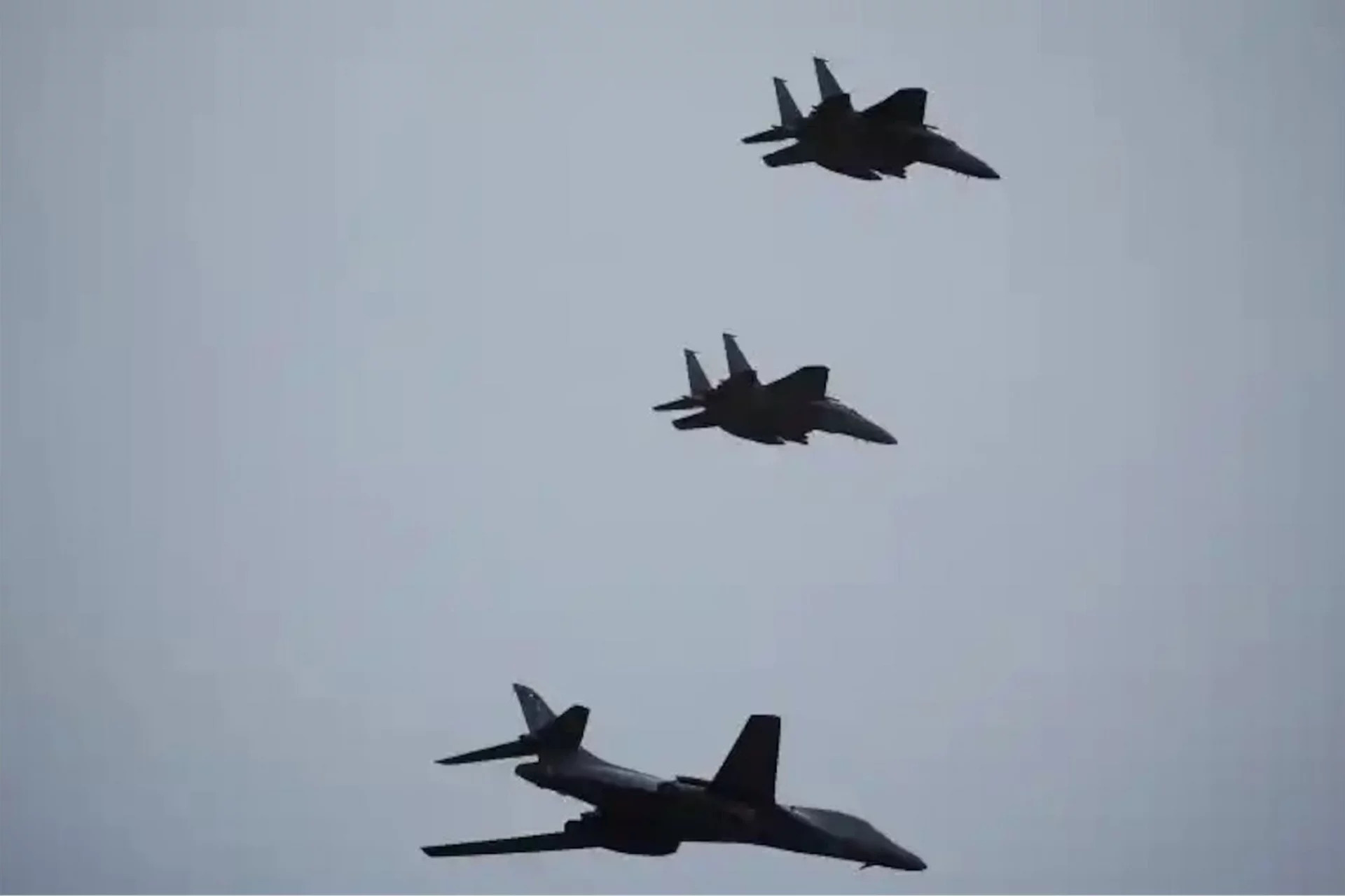 在韓國空軍F-15K戰鬥機伴飛下的美國空軍B1-B轟炸機(資料圖) 美國國防部