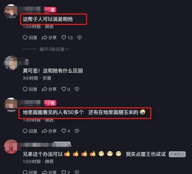視頻發佈者稱,從10月9日機器收割以來,每天都有村民來地裏撿拾玉米棒,行為十分危險,甚至還有人在未收割的地裏直接掰玉米棒,於是在勸説沒有效果之後,主人採取了用煙花驅趕人羣的做法。記者注意到,評論區大部分網友也表達了對安全方面的擔憂。
