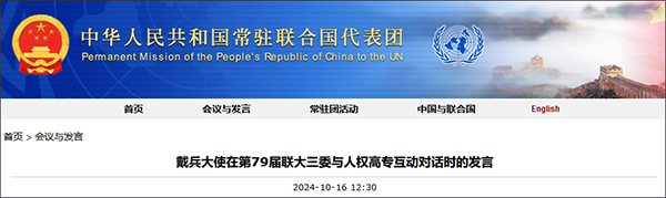 據中國常駐聯合國代表團網站10月16日消息,中國常駐聯合國副代表戴兵在第79屆聯大三委與人權高專互動對話時發言。