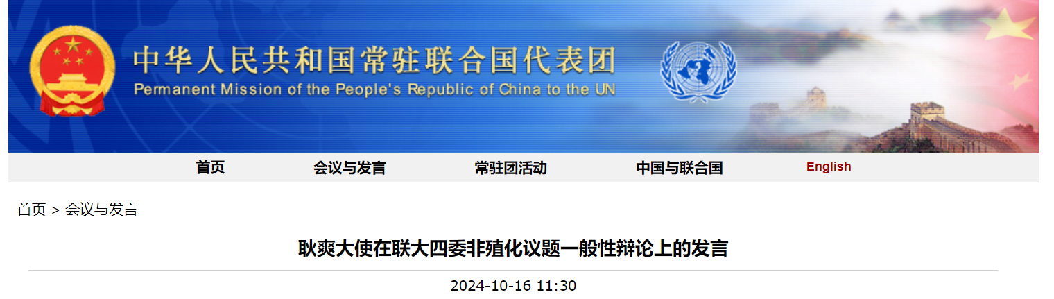 據中國常駐聯合國代表團網站消息,當地時間16日,耿爽大使在聯大四委非殖化議題一般性辯論上發言,全文如下: