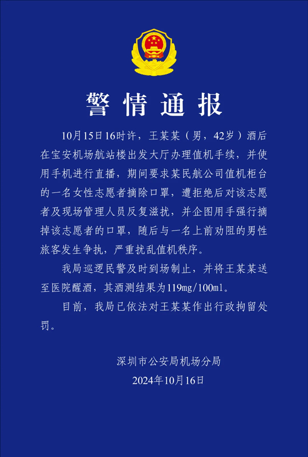 10月15日16時許,王某某(男,42歲)酒後在寶安機場航站樓出發大廳辦理值機手續,並使用手機進行直播,期間要求某民航公司值機櫃台的一名女性志願者摘除口罩,遭拒絕後對該志願者及現場管理人員反覆滋擾,並企圖用手強行摘掉該志願者的口罩,隨後與一名上前勸阻的男性旅客發生爭執,嚴重擾亂值機秩序。