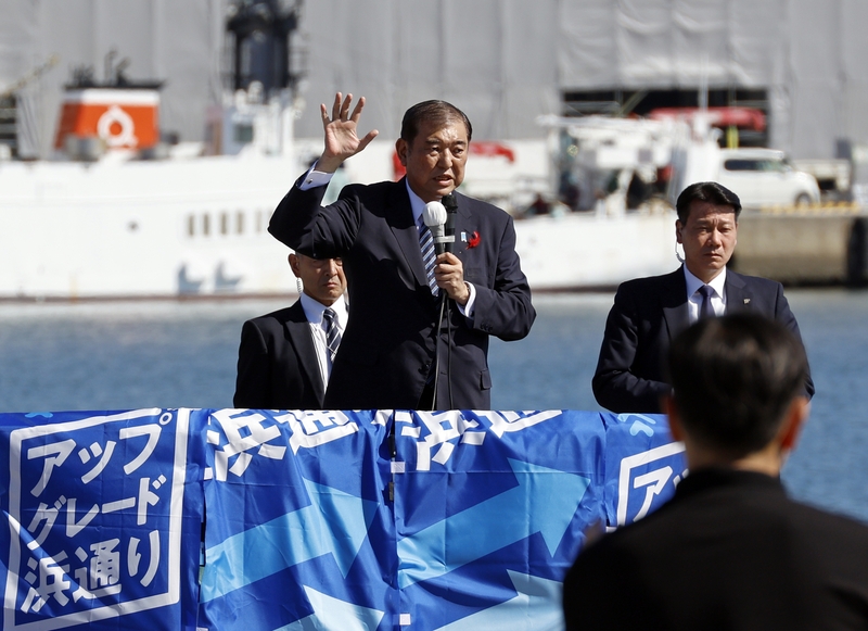 當地時間10月15日,日本東北部福島縣巖城,日本第50屆眾議院選舉公告發布,為期12天的日本眾議院選舉競選活動正式開始。日本首相石破茂發表演講拉選票。 IC Photo