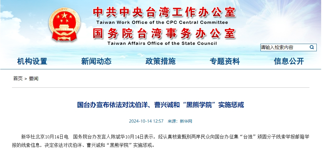 國台辦宣佈依法對沈伯洋、曹興誠和“黑熊學院”實施懲戒 國台辦