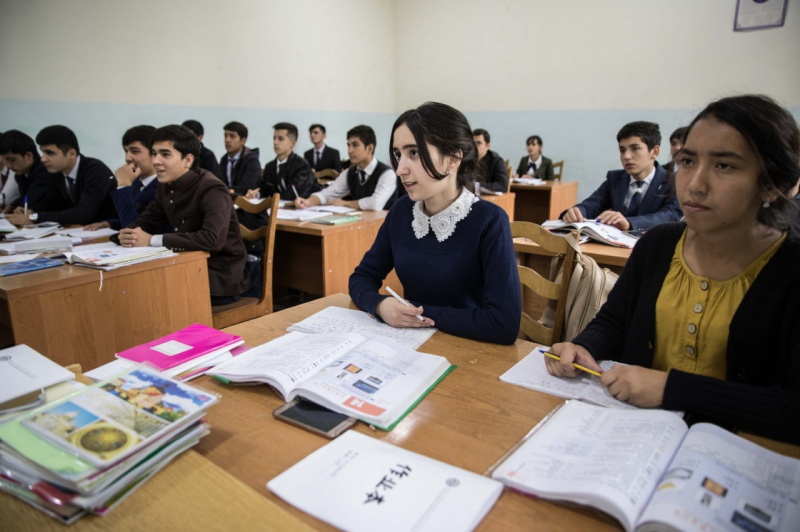 2018年10月10日,塔吉克斯坦首都杜尚別,孔子學院的學生在上漢語課。新華社