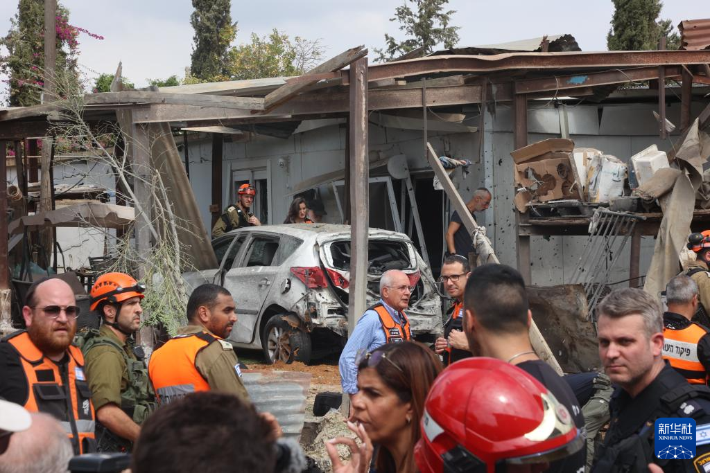 2023年10月7日,在以色列特拉維夫附近的哈巴德村,救援人員在火箭彈襲擊現場工作。新華社