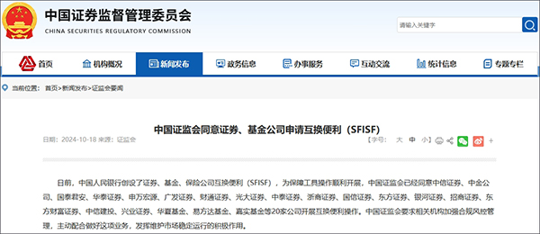 據證監會網站10月18日消息,日前,中國人民銀行創設了證券、基金、保險公司互換便利(SFISF),為保障工具操作順利開展,中國證監會已經同意中信證券、中金公司、國泰君安、華泰證券、申萬宏源、廣發證券、財通證券、光大證券、中泰證券、浙商證券、國信證券、東方證券、銀河證券、招商證券、東方財富證券、中信建投、興業證券、華夏基金、易方達基金、嘉實基金等20家公司開展互換便利操作。中國證監會要求相關機構加強合規風控管理,主動配合做好這項業務,發揮維護市場穩定運行的積極作用。